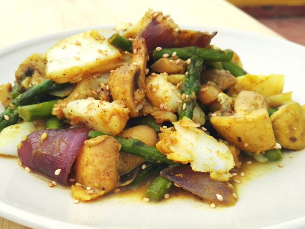 Snelle kerrie wokschotel met groene asperges & kabeljauw