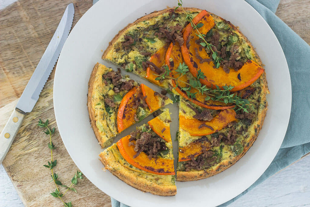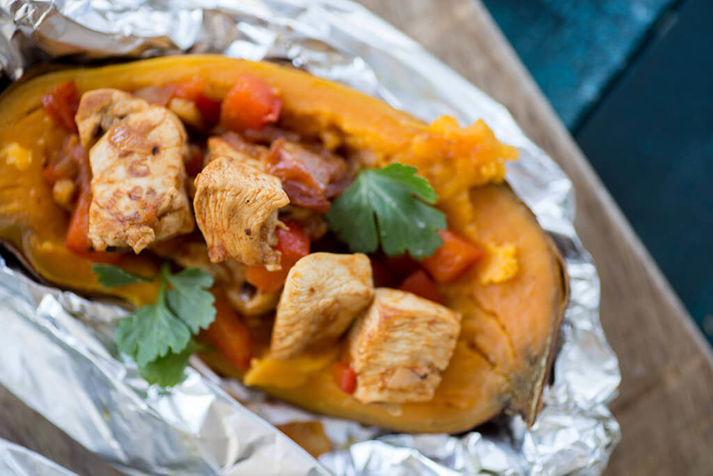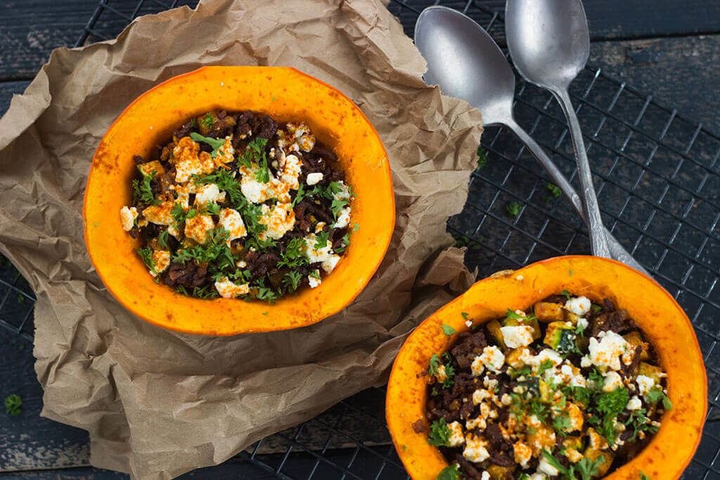 Gevulde spaghetti pompoen met zoete ui, gehakt en geitenkaas