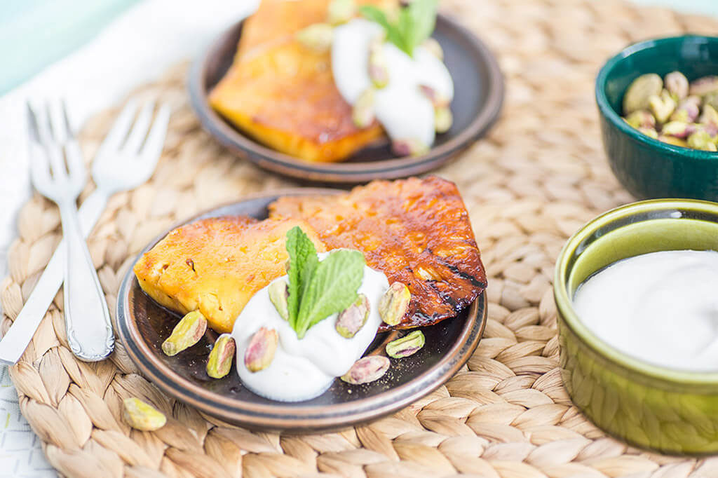 Gegrilde ananas met kokosroom, pistache en munt